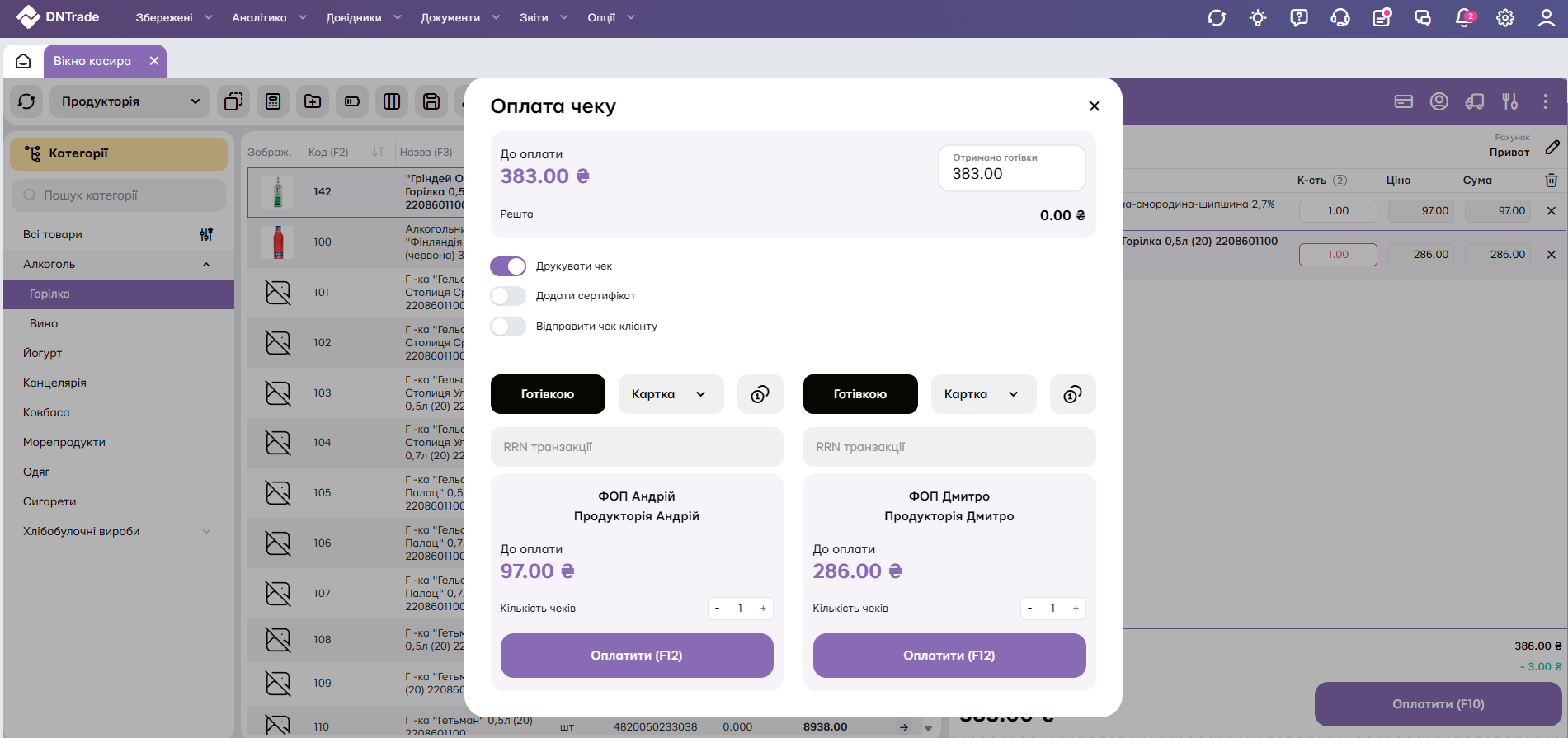 Повертаючись до прикладу із супермаркетом: це ідеальне рішення, коли касир пробиває підакцизний алкоголь та звичайні продукти в один кошик. Для налаштування розділення Ви підключаєте ПРРО Checkbox для кожного підприємця, а в налаштуваннях товарів вказується, яка категорія якому ФОПу належить. Далі все відбувається автоматично: касир натискає кнопку оплати, а програма сама розділяє товари та друкує два фіскальні чеки.