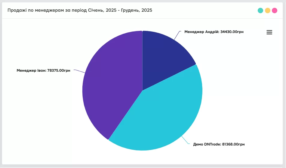 Ще однією важливою функцією нашої програми є автоматичний аналіз продаж і валового прибутку по кожному співробітнику. Такі звіти дозволяють оцінити, хто з менеджерів генерує найбільший дохід чи обсяг продажів, а кому потрібне додаткове навчання. Якщо зарплата залежить від відсотка обороту, система автоматично враховує дані співробітника та розраховує заробітну плату в модулі “Зарплата та кадри”, спрощуючи облік і економлячи час. Графічна аналітика дає змогу швидко переглядати та аналізувати дані в будь-який момент.